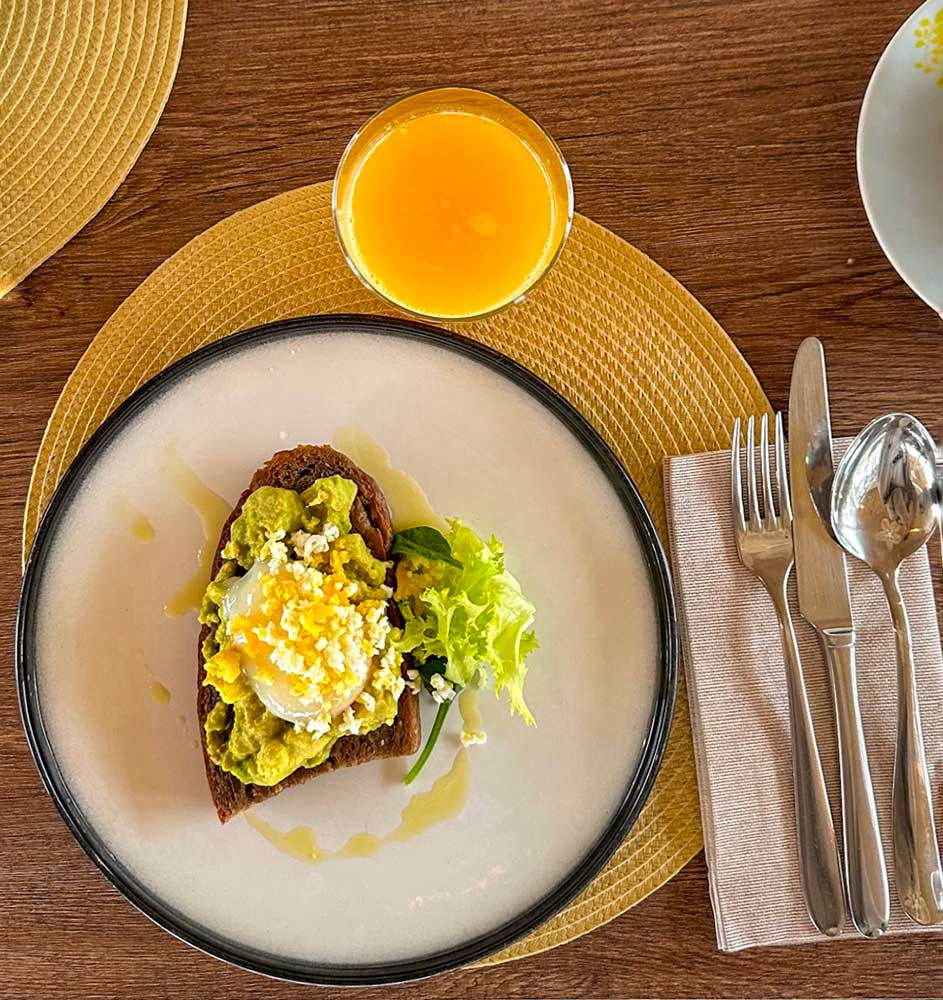 Avocado toast preparato con pane artigianale e uovo pochet, pancake salato con salmone, caprino e spinacino, una bontà unica.