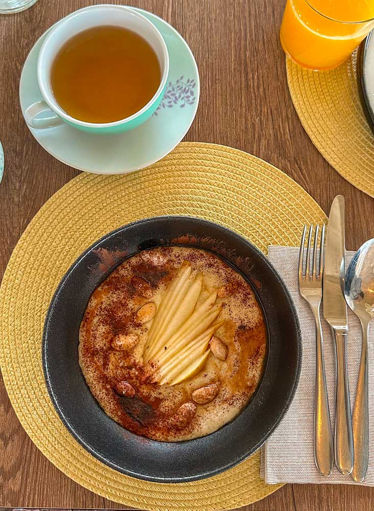 Mi ha stupito trovare il Porridge caldo con pere, cacao, miele, vaniglia e mandorle. Questo piatto nasce da un’antica ricetta anglosassone ed è a base di avena, arricchito a piacere con frutta fresca o frutta secca. E’ delizioso, sano e molto nutriente e non l’ho mai trovato da noi!