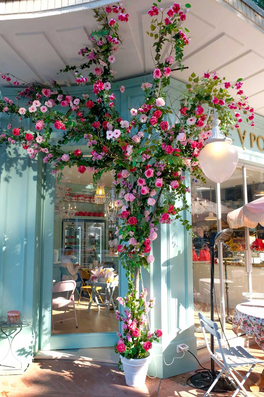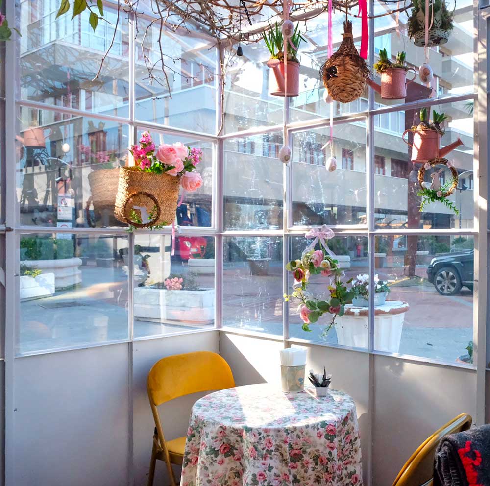 Ombrelloni in tessuto vichy regalano ombra alle sedute esterne, all’interno una serra luminosa con allestimento floreale e piccoli tavolini dove godersi la colazione e il brunch con tante golosità dolci e salate fra pasticceria e proposte salate.