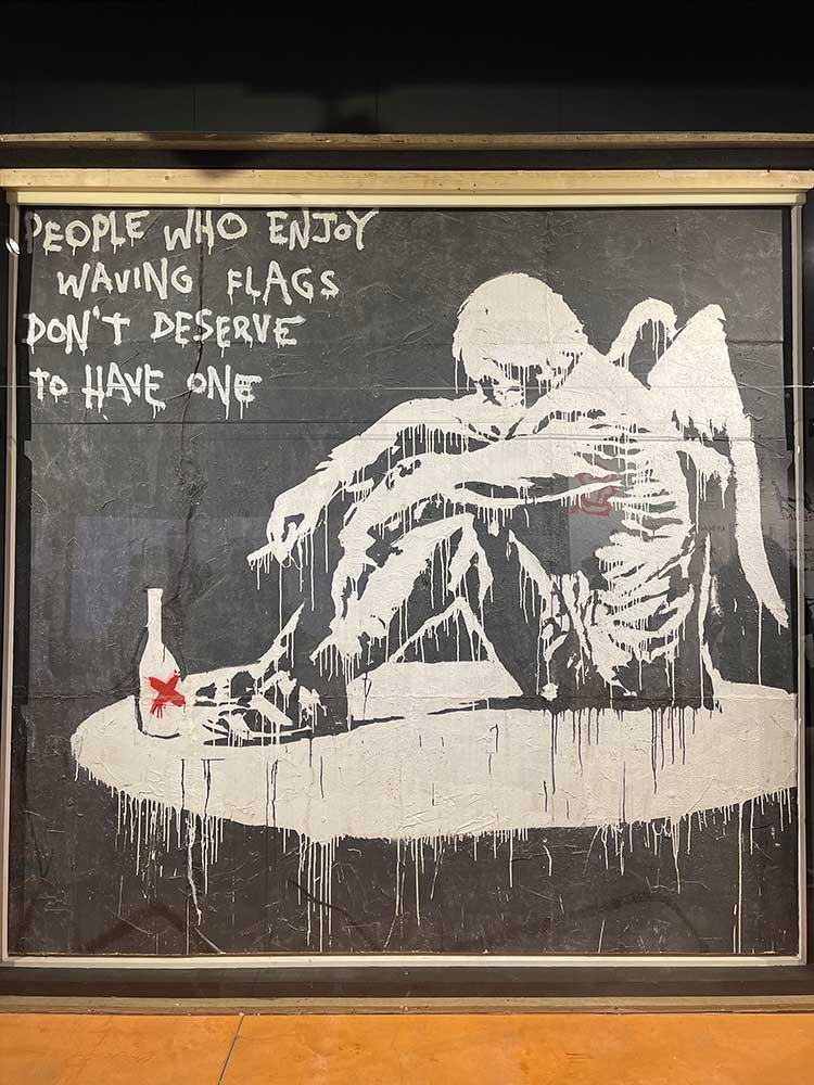 E’ possibile vedere opere dipinte sul muro originale, che sono state portate via e vendute al miglior offerente. Questo è uno dei motivi per cui le mostre di Banksy non sono mai autorizzate dall’artista.