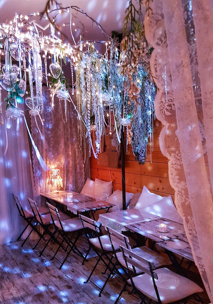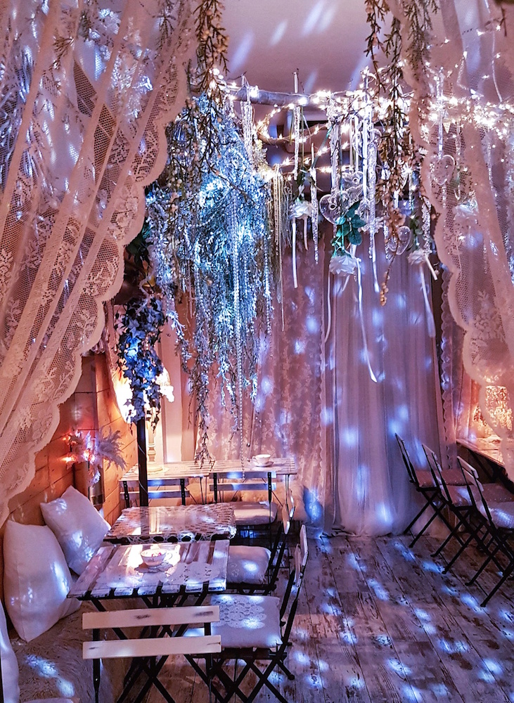 Tavolini semplici, cuscini e un tripudio di fiori bianchi, lucette, fili di perle e swarowsky scendono dal soffitto, creando un’atmosfera romantica e speciale, davvero da favola!