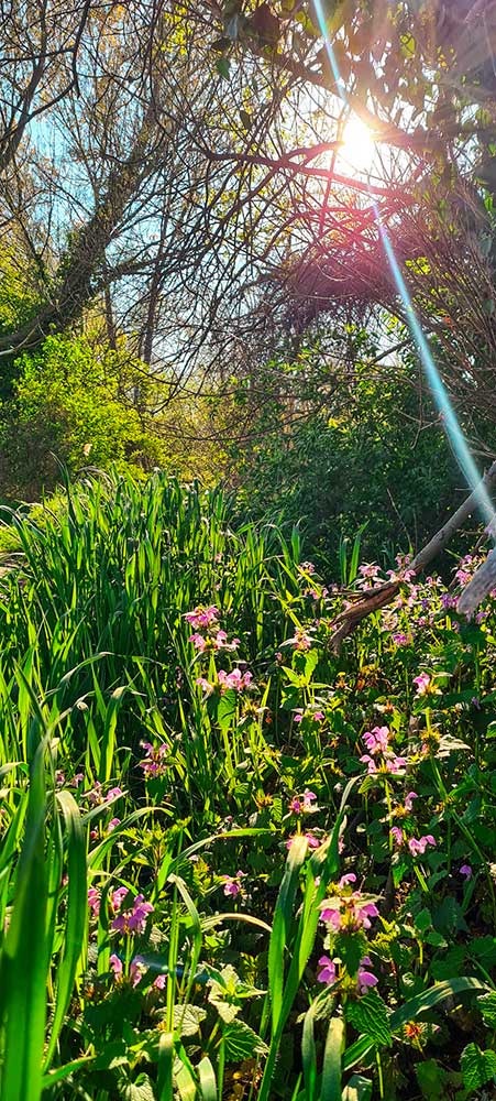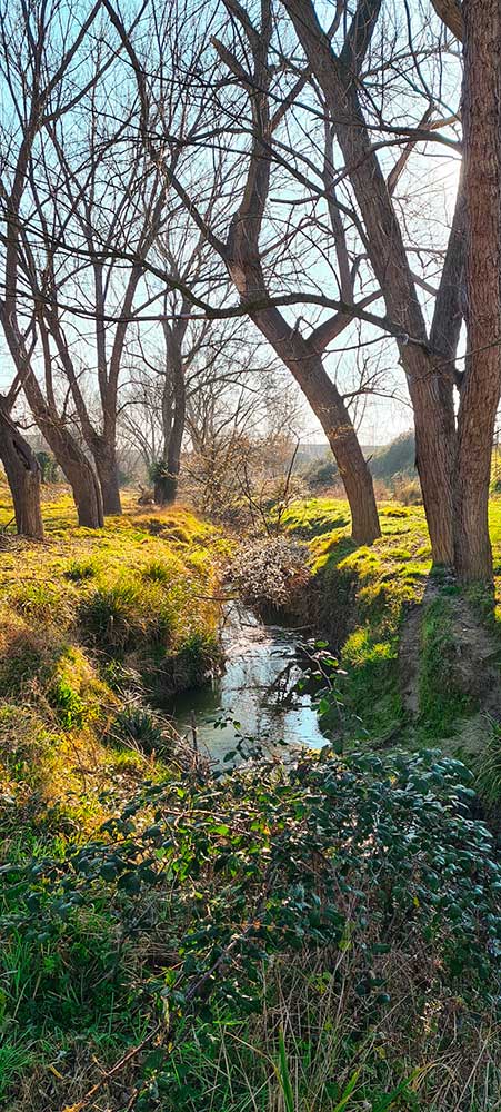 Il ruscello scorre lento, la luce del sole filtra dagli alberi regalando riflessi dorati all’acqua. Alberi in fiore, grandi distese di campi coltivati, fiori selvatici colorati e profumati rendono questo percorso un vero gioiello, ed è incredibile che si trovi a pochi chilometri dalle città di Riccione e da Coriano.