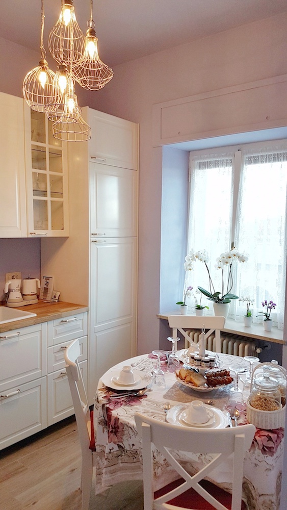 Pareti color lilla, tovaglia a motivi floreali e delicate ceramiche fanno da cornice alla colazione!