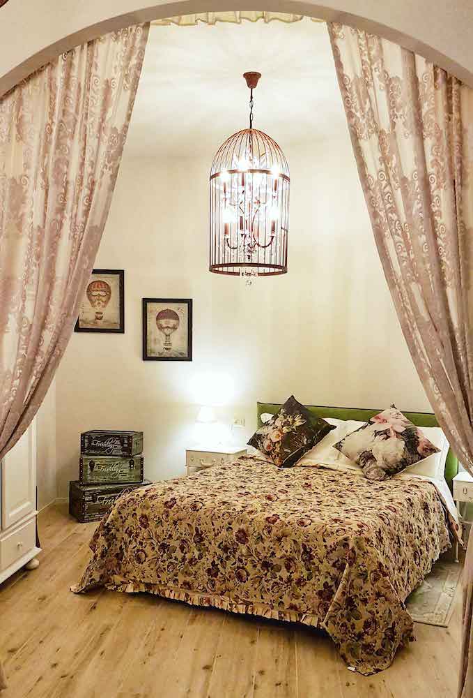Ho scelto la camera Peonia per la bellissima parete a fiori, con il grande divano che si trasforma in letto, per ospitare fino a 4 persone, e le finestre sulla Piazza Garibaldi. Anche il bagno è un tripudio di fiori e colori fra il lilla e il rosa, abbinamenti delicati che stupiscono e non stancano.